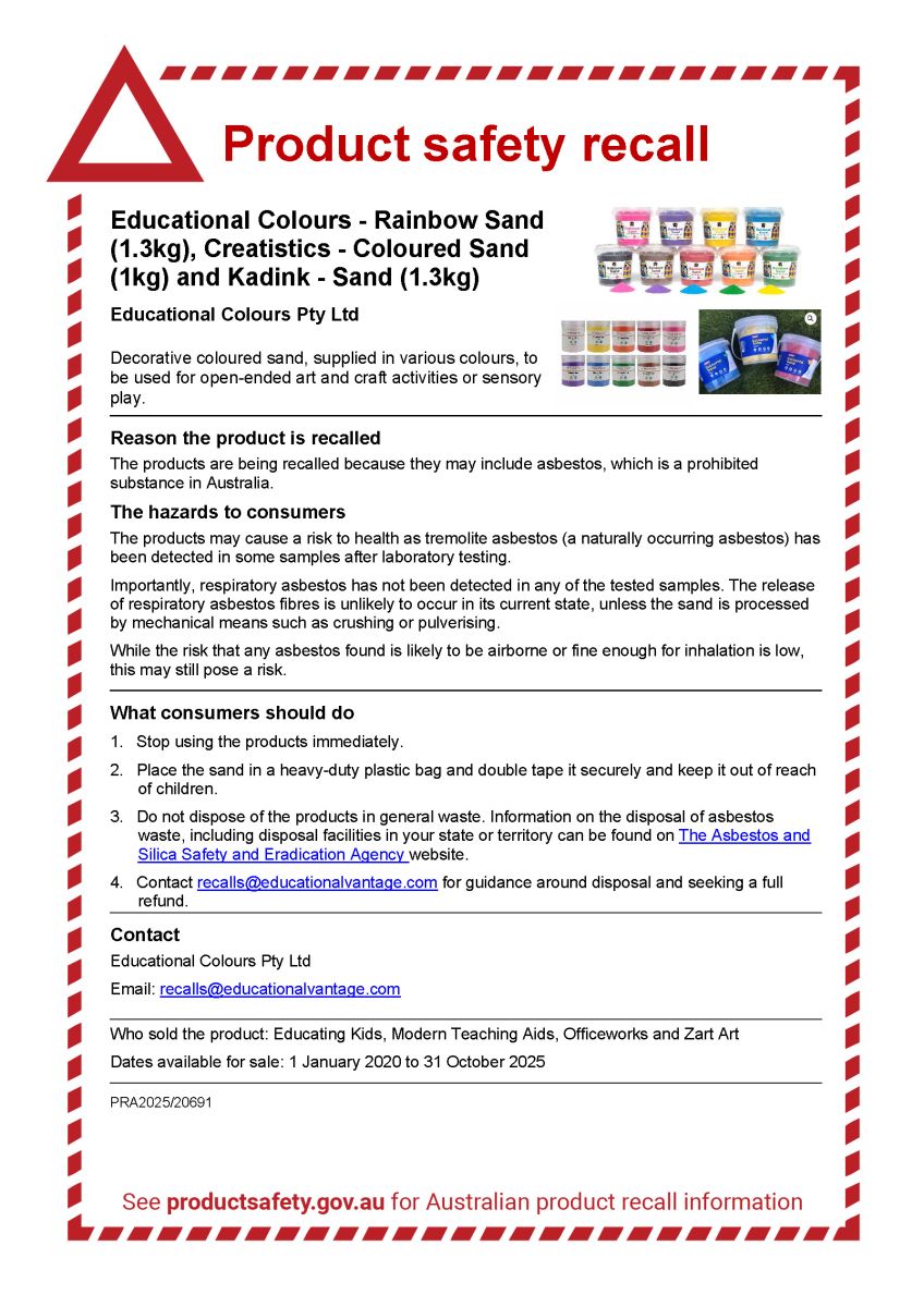 Certain coloured sand products supplied by Educational Colours Pty Ltd between 2021 and 2025 are subject to a voluntary recall.