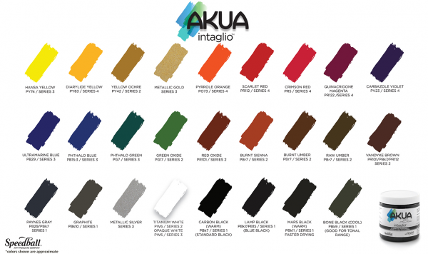 Akua Intaglio is a printmakers dream come true. Originally formulated for intaglio printmaking, this ink can also be applied with a brayer for relief printmaking, monotype, and collagraphs; and it will print from any plastic, wood, linoleum or metal plate. They contain no driers, offering a long working time for monotype or wiping the plate.