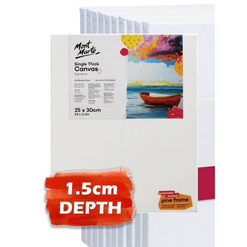 Mont Marte Single Thick Studio Canvases are ideal for those beginning in the practice of art. These canvases are back stapled for a clean edge look. Suitable for light applications of paint. The Environmentally friendly cotton duck canvas is triple acrylic titanium primed and ready to be painted on.