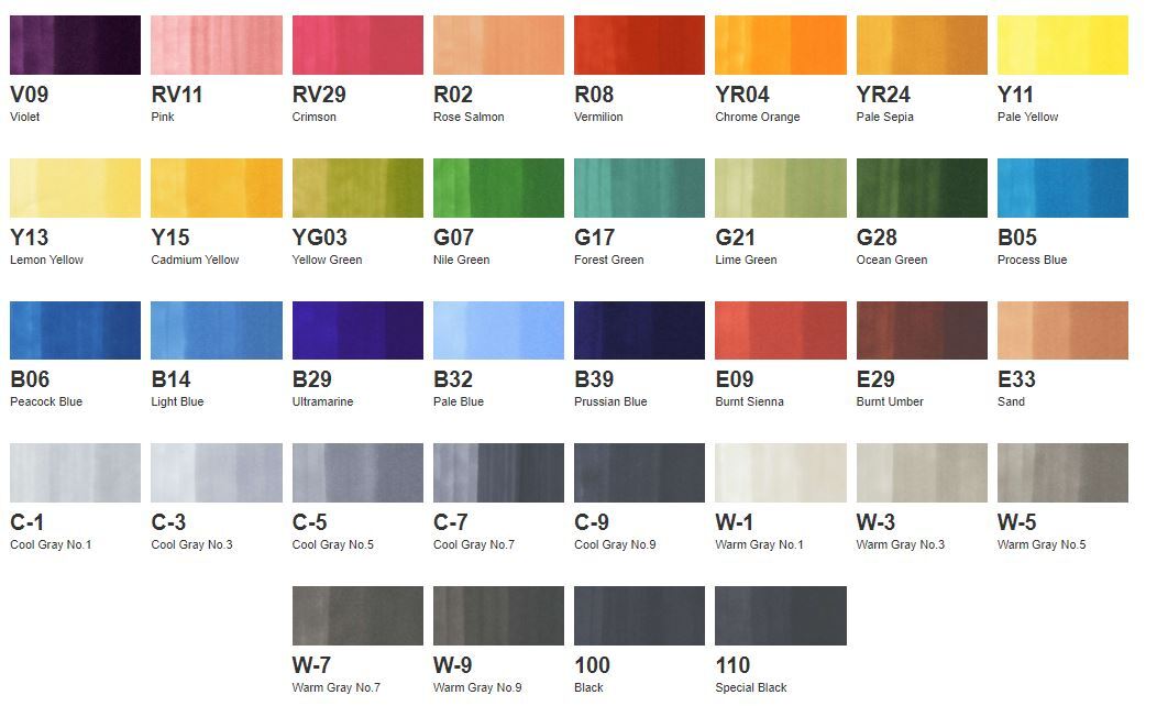A comprehensive starter set including a wide Gray scale selection and basic colors commonly used in design and comic illustration.