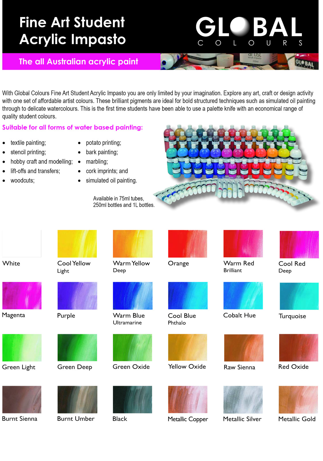 With Global Colours Fine Art Student Acrylic Impasto you are only limited by your imagination. Explore any art, craft or design activity with one set of affordable artist colours. These brilliant pigments are ideal for bold structured techniques such as simulated oil painting through to delicate watercolours. This is the first time students have been able to use a palette knife with an economical range of quality student colours.