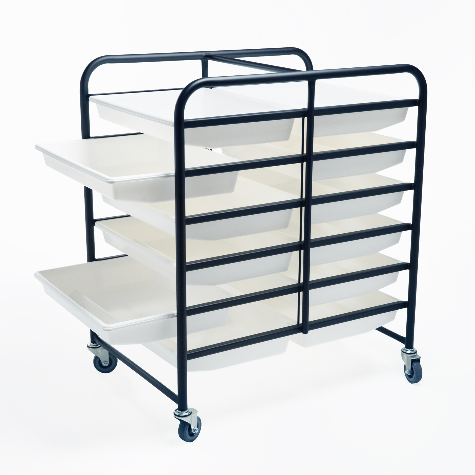 This mobile tray storage has all the benefits of a strong powdercoated steel frame and heavy duty castors.