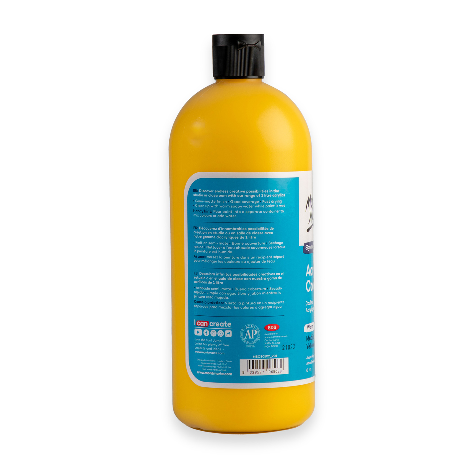Dive into the world of painting with Mont Marte's Acrylic Colour Paint 1L. These vibrant paints come in a range of colours and feature a smooth and creamy texture suitable for most surfaces, including canvas, cardboard, leather and more. The 1L economical size is ideal for the classroom, and thanks to the easy squeeze-and-pour design, you can get the most out of the bottle. Plus, they dry quickly to a semi-matte finish, so colours can be layered during class time without getting muddy. Inspire some creativity and plenty of fun with our acrylic paint.