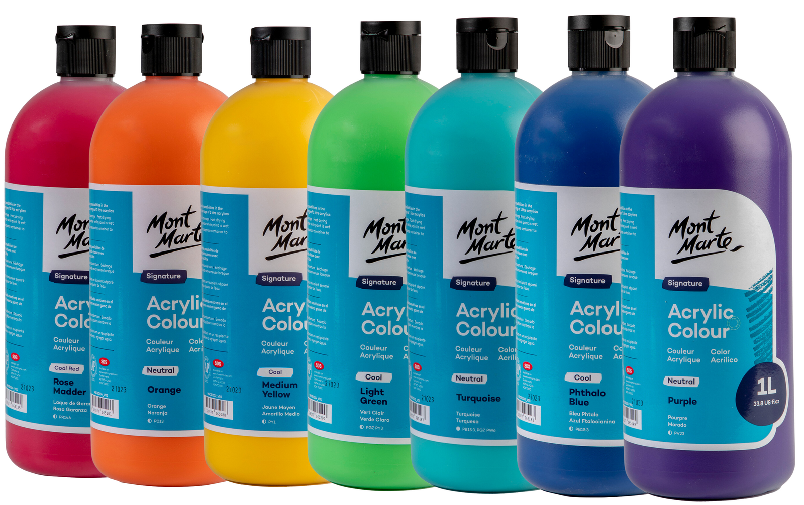 Dive into the world of painting with Mont Marte's Acrylic Colour Paint 1L. These vibrant paints come in a range of colours and feature a smooth and creamy texture suitable for most surfaces, including canvas, cardboard, leather and more. The 1L economical size is ideal for the classroom, and thanks to the easy squeeze-and-pour design, you can get the most out of the bottle. Plus, they dry quickly to a semi-matte finish, so colours can be layered during class time without getting muddy. Inspire some creativity and plenty of fun with our acrylic paint.
