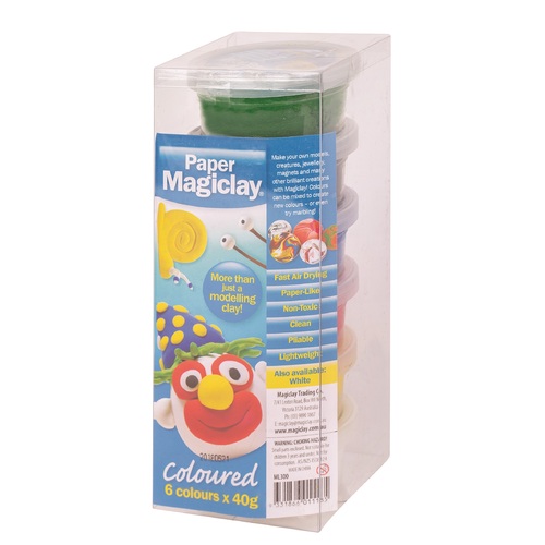 Paper Magiclay is an air drying modelling clay that is lightweight, soft and elastic. This coloured soft paper clay will bond wet to dry, no adhesives or tools are required. Colours can be mixed together to further extend the colour palette. Magiclay can be pulled, stretched, rolled and embossed.