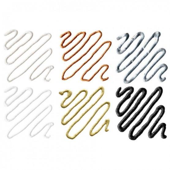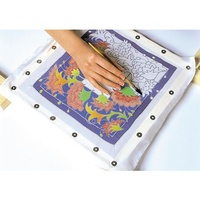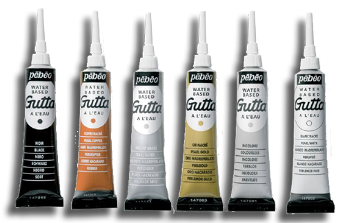 The water based guttas have a thick consistency and are used to create outlines – the Serti technique. The colours are pearlescent. The guttas are used directly from the tube and nozzle or from a pipette and gutta nib. They flow readily into the silk fibres forming a barrier to the colour. Setasilk is applied afterwards. All the guttas can be washed after having been iron fixed with the exception of the colourless gutta which is designed to wash out leaving a white line on the fabric where it has been applied.