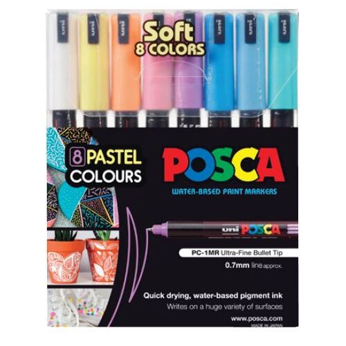 Eight extra fine bullet tip POSCA pens in a pastel colour story.