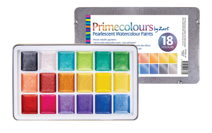 Primecolours Pearlescent Watercolour Paints deliver vibrant metallic colour with the ease and portability of a semi-moist watercolour palette. Packed with intense pigment and minimal filler, these paints offer the brilliance and saturation of artist-quality tube paint, but in a compact, ready-to-use format. Simply add water to activate the colours and enjoy smooth application with a shimmering finish. Add small amounts of water for opaque, gouache-like results which emphasise the metallic qualities of these palettes. The semi-dried formula ensures less mess and easy cleanup, making these palettes ideal for classroom use.