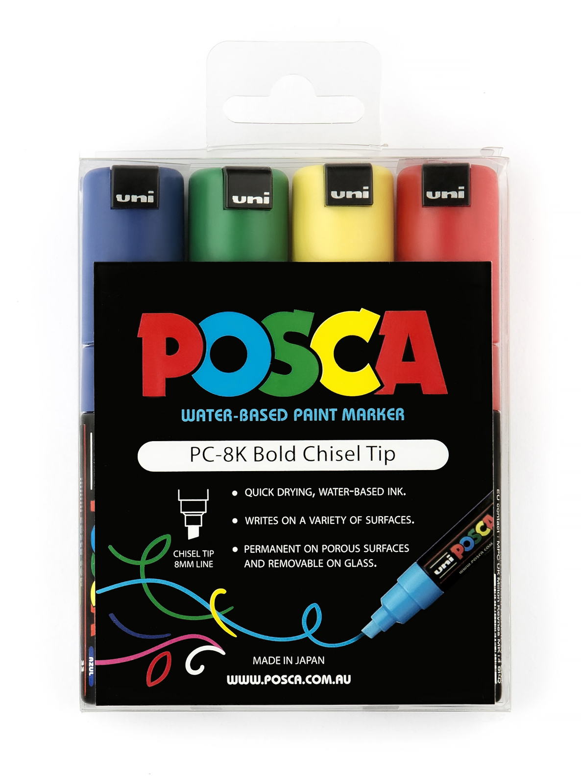 This marker set features four primary coloured chisel tip (4.5mm) Posca pen markers. Posca markers have quick drying water-based pigment ink and can be used on a variety of surfaces including paper, metal, glass, wood and plastic.